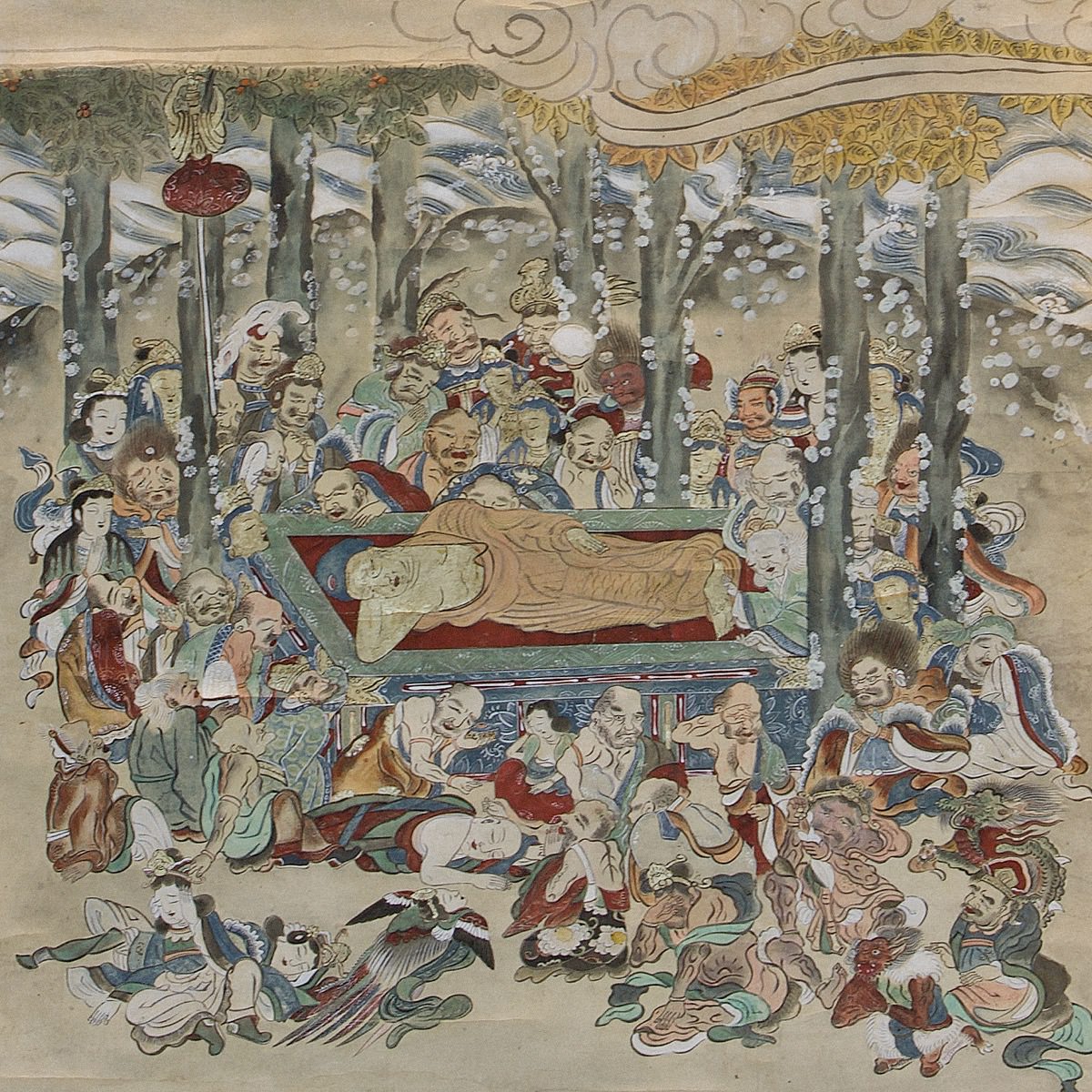 涅槃会(ねはんえ)とは、お釈迦様の入滅(亡くなられた)された2月15日の行事です。お寺では涅槃図(ねはんず)といって、お釈迦様が入滅される時の様子を描いた掛け軸をかけて報恩の法要を営みます。